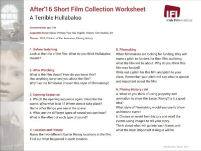 In collaboration with IFI Education, each of the After’16 short films includes a complimentary Classroom Worksheet. These are downloadable documents that can be used as a guide for teachers and students. The nine short films in this collection have not been classified so an age recommendation has been added to each film. While most of the films are suitable for a 12+ audience, the content and lesson ideas are geared towards Transition Year +. As with all content on the IFI Archive Player, we recommend that you view the material in advance of showing them in class.