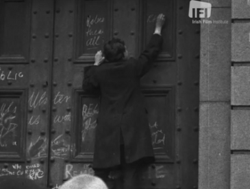 November 1961 and students from Trinity College marched the main streets of Dublin in protest at nuclear bomb testing. The Campaign for Nuclear Disarmament, CND, was established in the UK in 1958 in the wake of widespread fear of conflict and the effects of nuclear testing. CND quickly grew with branches in Scotland, Wales and Ireland. This newsreel recorded Irish student protesters as they marched in Dublin from St. Stephens Green to the Ambassador Theatre on O’Connell Street. Their placards demanded ‘Ban the Bomb’ and called for world peace.