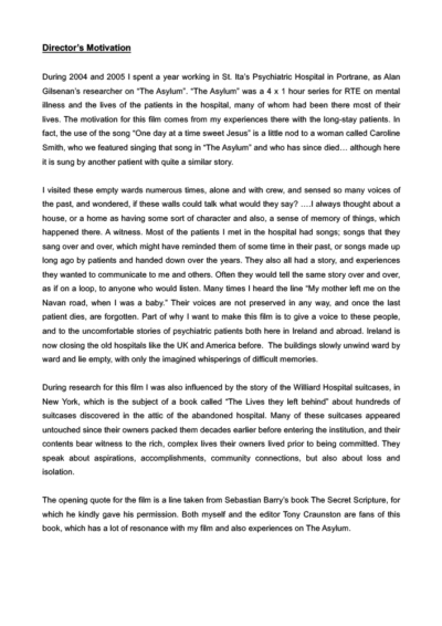 Opening with a quotation from Sebastian Barry’s novel The Secret Scripture, in which the main character is a resident in a Roscommon mental institution, the film takes us on a haunting tour of a vast and desolate building, once an Irish asylum. The voices of former residents describe their experience recounting their loneliness and suffering, and the harsh practice of electroconvulsive therapy (ECT). Their recollections reveal how people were committed and shed light on the social, economic and political factors that lead to their admission. The decision to feature voices and not faces allows the residents to maintain their anonymity.