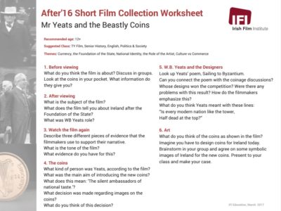 In collaboration with IFI Education, each of the After’16 short films includes a complimentary Classroom Worksheet. These are downloadable documents that can be used as a guide for teachers and students. The nine short films in this collection have not been classified so an age recommendation has been added to each film. While most of the films are suitable for a 12+ audience, the content and lesson ideas are geared towards Transition Year +. As with all content on the IFI Archive Player, we recommend that you view the material in advance of showing them in class.