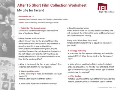 In collaboration with IFI Education, each of the After’16 short films includes a complimentary Classroom Worksheet. These are downloadable documents that can be used as a guide for teachers and students. The nine short films in this collection have not been classified so an age recommendation has been added to each film. While most of the films are suitable for a 12+ audience, the content and lesson ideas are geared towards Transition Year +. As with all content on the IFI Archive Player, we recommend that you view the material in advance of showing them in class.